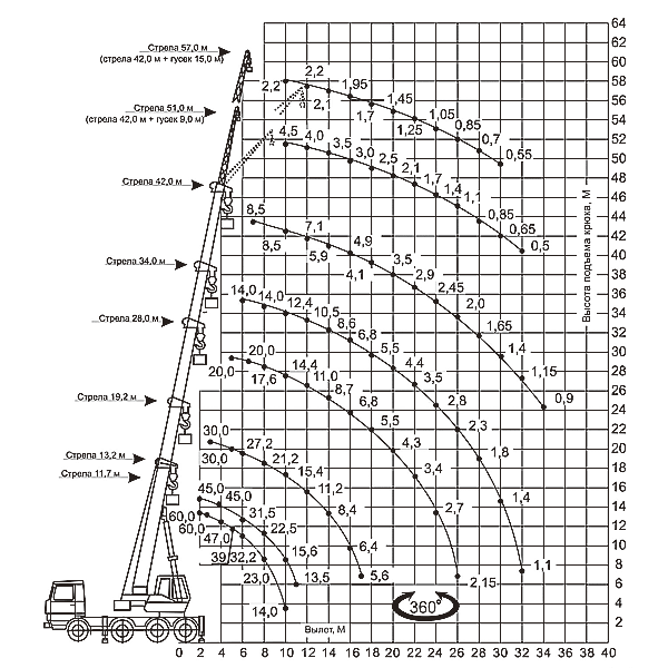 Автокран 60 тонн имеет регулируемую длину стрелы — от 11,7 до 42 м, — что позволяет выполнять любые работы даже в стесненных условиях.